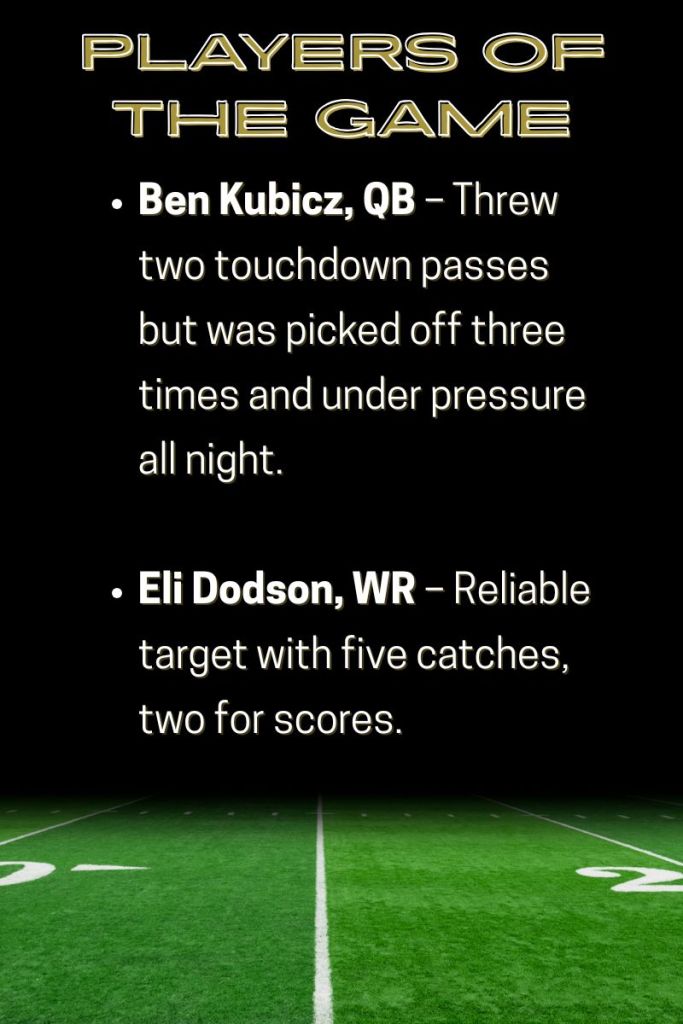 Quarterback Ben Kubicz capped a 10-play, 85-yard drive – their best one of the evening – with a 16-yard scoring pass to Eli Dodson just before halftime.